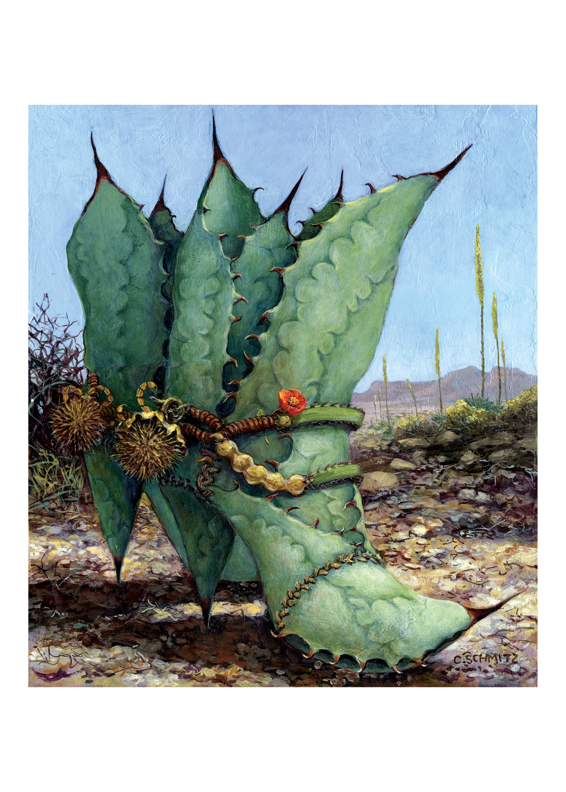 Agave leaves, Sotol leaves, Datura pods, Mesquite pods, Scorpion tails, Yucca fiber.
