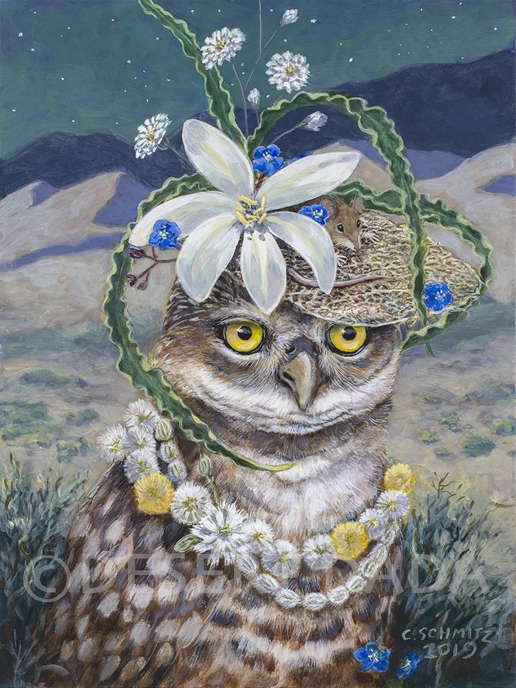 A Burrowing Owl from Ajo turned heads at the Wild Hat Celebration. Her tree-dwelling kin were envious. Unlike them, she often puttered about among the desert shrubs in search of rodents. One dusky evening she had come upon some low dunes illuminated by colonies of Desert Lilies. “Whoooo”, she whispered. Here was The Look she wanted!