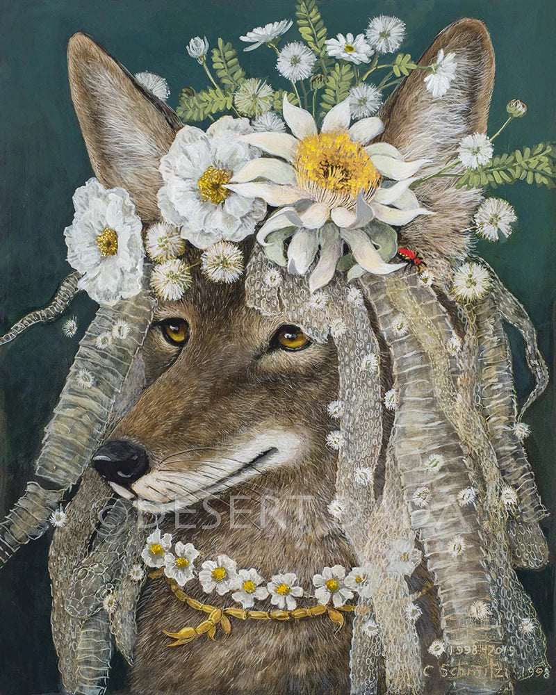 A coyote glows in white and gold beneath prickly poppies, desert fern and gravel ghost flowers, mesquite leaves, and an organ pipe cereus blossom. Blackfoot daisies and precious scorpion tails encircle her neck. An Apache jumping spider treads along the edge of the crinkly snake skin veil dotted with tiny creosote seeds.