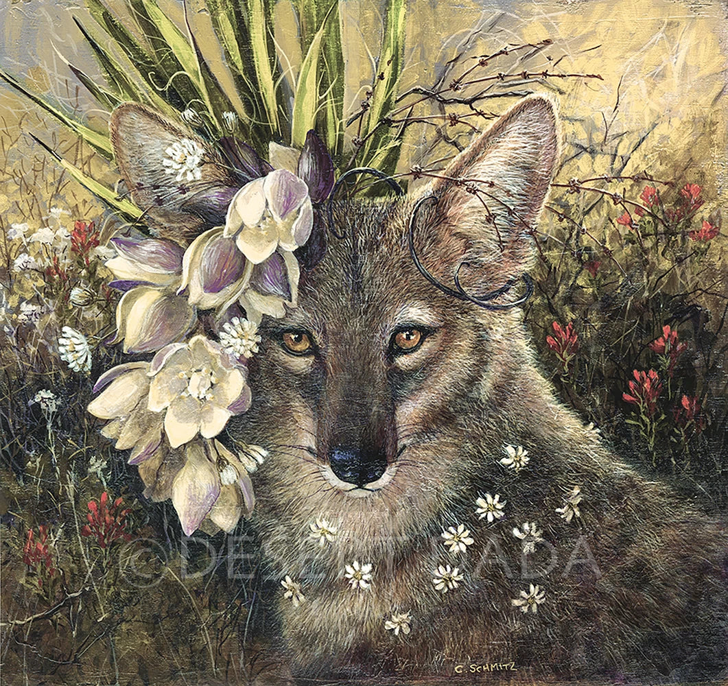 Loping in from Death Valley, a coyote posed elegantly in a cascade of Mojave Yucca leaves and blossoms, with accents of Devil’s Claws, buckwheat, and Gravel Ghost flowers. A sprinkle of Mojave Desert Stars across her neck and shoulders convinced her that simplicity and grace would win her the award for the loveliest hat.