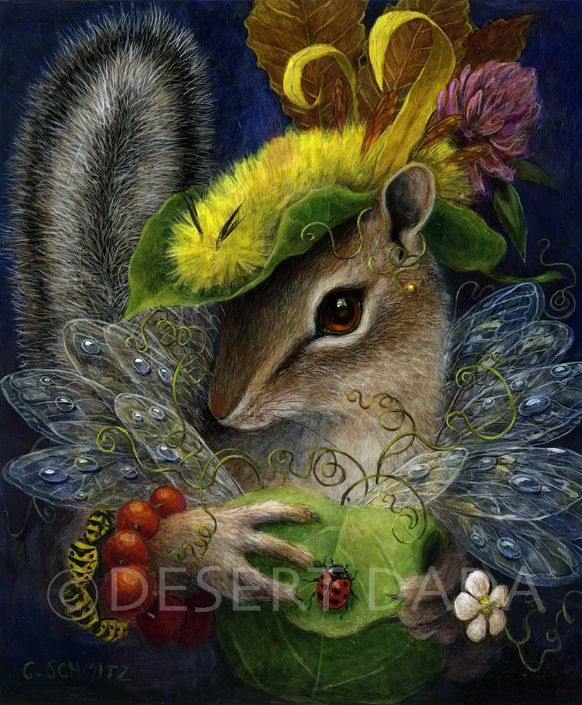 Eastern Chipmunk with chestnut oak leaves, willow leaves, wasp wings, red clover, caterpillar, apple leaf, grape vines, droplet of honey, cicada wings, dew drops, holly berries, hornet bodies, mullein leaf, ladybug, chokecherry blossom.