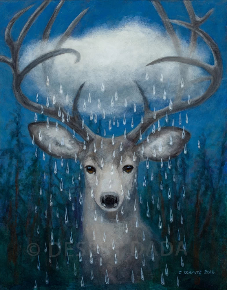 The idea for this painting was for one of 10 wine labels I did for Fowles Wine, in Australia. They decided instead to use their idea – an old boot in the deer’s antlers, because it related to their working farm. Then I painted the other one for myself, and called it Forest Rain, because it relates to my home environment and the ever-present desire for rain. You can see the other wine labels at Fowleswine.com, in their “Are You Game?” collection.