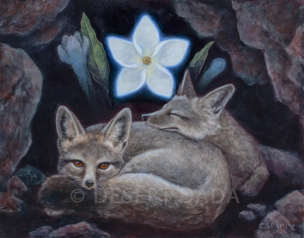 This painting began as one of many sketches for an animated video I made for Center for Plant Conservation, a national organization based in San Diego. For a very short video, not every idea could be fit in, so this one didn’t make it. But I liked the image, so did it for myself. Two kit foxes are dreaming of a desert flower, Kearney’s Blue Star, Amsonia Kearneyana.