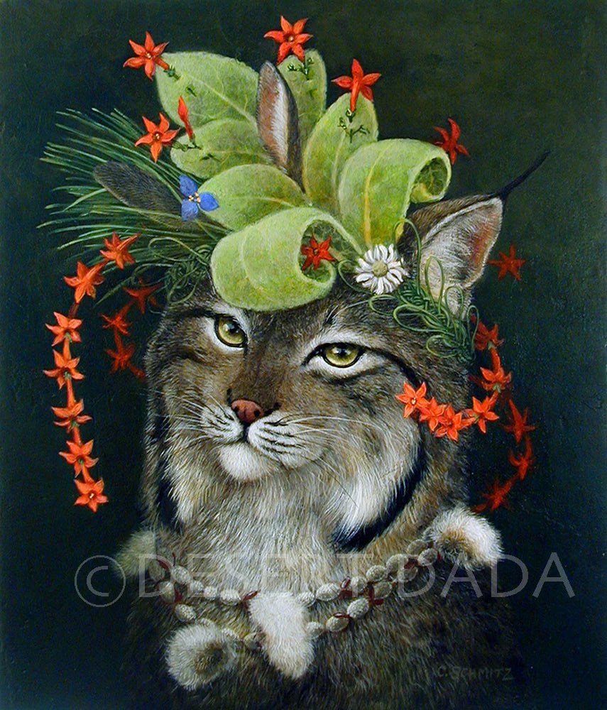 A bobcat, identified by his tufted ears and luxurious chops, was more than pleased with his forest topknot–as compensation for his short tail, perhaps. Overlapping Mullein leaves sprung from a headband of macrame pine needles. One Silvery Townsendia daisy, a Western Dayflower, and arcs of Scarlet Gilia would have been enough. “But how could I NOT tuck in a couple of rabbit ears,” he mused. “And their cottony tails looked so nice with the Pussy Willows.”