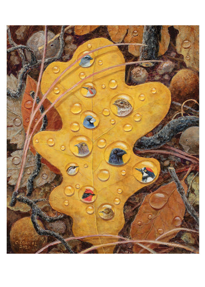 A variety of birds are reflected in the rain drops scattered on an oak leaf.